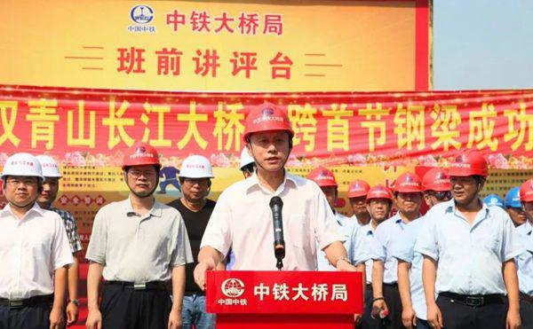 2018年8月8日上午,武漢青山長江大橋主跨鋼梁首架儀式在武昌岸現(xiàn)場舉行。中鐵大橋局副總經(jīng)理張春新出席活動(dòng)并致詞,武漢交投總經(jīng)理陳順平出席儀式并宣布大橋主跨首節(jié)鋼梁架設(shè)成功,中鐵大橋院副總經(jīng)理莊勇出席了活動(dòng)。